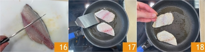 Nun nehmen Sie die Doradenfilets, entfernen die Gräten und teilen Sie jedes in der Hälfte, ohne die Haut abzuziehen 16. In einer heißen Pfanne mit etwas Öl legen Sie die Filets mit der Hautseite nach unten und drücken sie leicht mit einem Spatel an 17. Braten Sie bei mittelhoher Hitze, bis die Mitte weiß wird, dann salzen Sie 18.