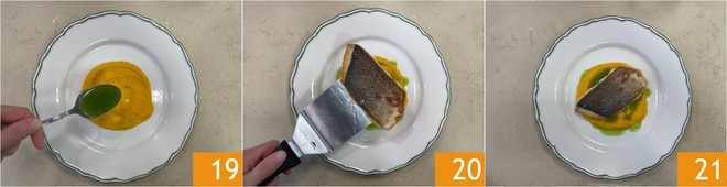 Sie sind bereit zum Anrichten: Verteilen Sie die Karottencreme am Boden, dann fügen Sie das Basilikumöl hinzu 19 und legen Sie das Doradenfilet darauf 20. Ihre gebratene Dorade auf Karottencreme ist servierbereit 21!