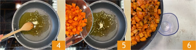 Erhitzen Sie in einer Pfanne das Öl mit Ingwer und Knoblauch 4, fügen Sie dann die Karotten hinzu 5 und kochen Sie sie bei mittlerer Hitze für etwa zehn Minuten. Sobald sie weich geworden sind, entfernen Sie den Knoblauch und geben die Karotten in einen Behälter 6.
