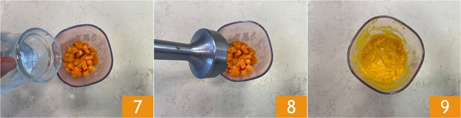 Fügen Sie auch das Wasser 7, das Öl und das Salz hinzu, dann pürieren Sie mit einem Stabmixer 8, bis Sie eine glatte und homogene Creme erhalten 9.