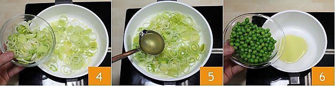 und geben Sie den Lauch dazu 4 und lassen Sie ihn unter Zugabe einer Kelle Gemüsebrühe weitergaren 5. In einem anderen kleineren Topf geben Sie einen Esslöffel Olivenöl und fügen die Erbsen hinzu 6,