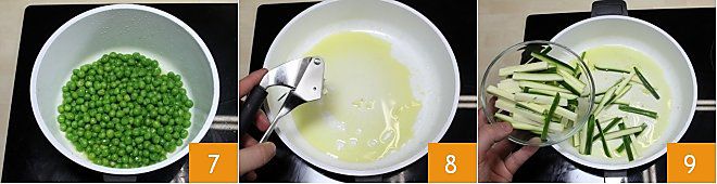 lassen Sie sie 15 Minuten lang garen 7 und geben Sie auch hier eine Kelle Brühe dazu und lassen Sie sie noch einige Minuten köcheln. Die Erbsen sollten eine schöne leuchtend grüne Farbe behalten und recht knackig bleiben. In einem anderen Topf geben Sie das restliche Öl und zerdrücken die Knoblauchzehe 8. Fügen Sie die Zucchini zum Öl hinzu und lassen Sie sie einige Minuten garen 9,