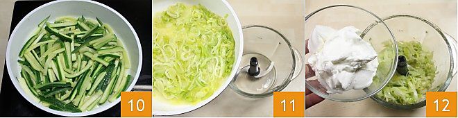 die Zucchini sollten nicht zerfallen, sondern intakt bleiben 10. Wenn der Lauch gar ist, geben Sie ihn zusammen mit dem Joghurt in einen Mixer 11 12