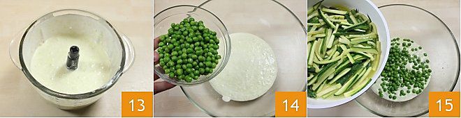 und pürieren alles, bis eine homogene Creme entsteht 13. In einer Schüssel geben Sie die Joghurtcreme, die Erbsen 14, die Zucchini 15 hinzu, salzen und pfeffern