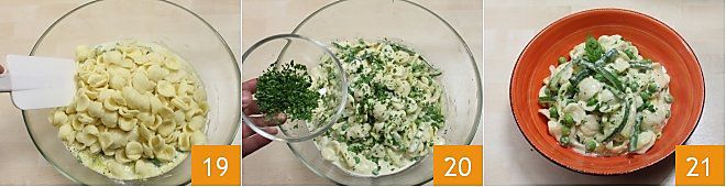 und vermengen alles gut 16. Dann kochen Sie die Orecchiette in reichlich gesalzenem Wasser 17, sobald die Pasta gekocht ist, geben Sie sie in die Schüssel 18 zusammen mit der Joghurtcreme und dem Gemüse,