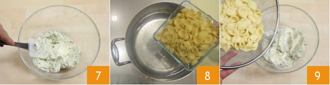 Sobald die Creme homogen ist 7, stellen Sie sie beiseite, bedeckt mit Frischhaltefolie, und kochen Sie die Orecchiette in reichlich gesalzenem Wasser nach Belieben 8. Gießen Sie sie noch al dente ab (behalten Sie ein Glas Kochwasser). Fügen Sie die Orecchiette zur vorbereiteten Soße hinzu 9