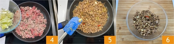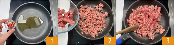 Um die orientalischen Röllchen zuzubereiten, bereitet als erstes ein Sofrito mit Öl, Knoblauch und Chilischoten zu. Erhitzt es, um Geschmack zu verleihen, dann fügt das Fleisch und die Wurst hinzu 2. Zerdrückt es mit einem Schneebesen, um es zu zerkleinern 3.