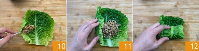 Legt ein Wirsingblatt auf ein Schneidebrett und positioniert die Füllung im unteren Teil 10. Faltet die seitlichen Ränder 11 und rollt es auf 12.