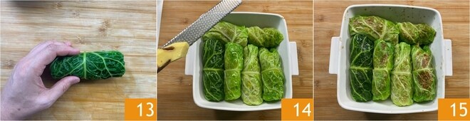 So habt ihr eure ersten Wirsingröllchen erhalten 13. Macht so weiter mit den anderen und legt sie nach und nach in eine Backform. Würzt mit einer Prise Salz, dem geriebenen Ingwer 14 und einem Schuss Öl. Backt sie bei 190° für 20 Minuten im statischen Modus.