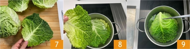 Trennt die Blätter vorsichtig vom Wirsing ab 7, entfernt dabei eventuell die beschädigten äußeren. Ihr braucht 10 davon. Blanchiert sie in kleinen Portionen für 4-5 Minuten 8. Hebt sie vorsichtig mit einer Zange heraus 9 und entfernt das überschüssige Wasser, achtet darauf, die Blätter nicht zu brechen; ihr könnt sie mit Küchenpapier abtupfen.
