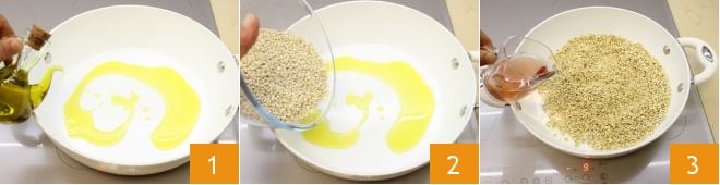 Um das Orzotto mit Jakobsmuschelcreme zuzubereiten, beginnen Sie mit der Zubereitung der Krustentierbrühe (alternativ der Gemüsebrühe). Erhitzen Sie 15 g Olivenöl in einer Pfanne 1, geben Sie die Perlgerste hinzu und rösten Sie sie kurz an 2, löschen Sie sie mit 50 g Roséwein ab 3 und