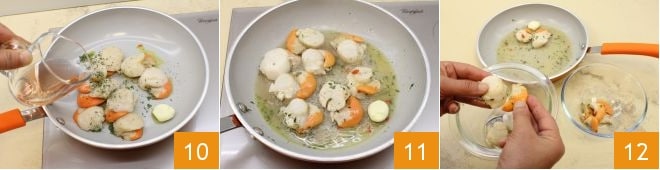 löschen Sie mit 50 g Roséwein ab 10, salzen und pfeffern Sie und lassen Sie die Jakobsmuscheln für ein paar Minuten anbraten 11, nicht länger, da sie sonst gummiartig werden. Nach dem Kochen entfernen Sie das rote Bändchen, das Koralle genannt wird 12, und bewahren Sie es auf,
