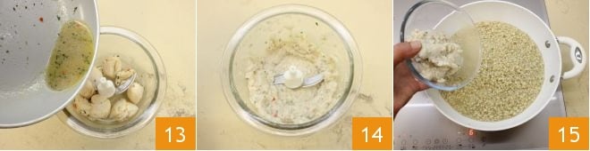 sammeln Sie den weißen Teil der Schalentiere in einem Mixer mit Klingen zusammen mit dem Bratfond 13. Pürieren Sie die Jakobsmuscheln, bis Sie eine cremige Masse erhalten 14. In der Zwischenzeit ist die Gerste fertig gekocht, geben Sie die erhaltene Jakobsmuschelcreme hinzu 15 und rühren Sie um, um die Creme zu vermischen und die Zubereitung zu würzen.