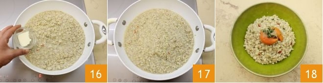 Zum Abschluss mit der Butter 16 vermengen und noch einmal umrühren, um sie vollständig zu schmelzen 17. Ihr Orzotto mit Jakobsmuschelcreme ist bereit zum Genießen, servieren Sie es mit den beiseitegelegten Korallen garniert 18.