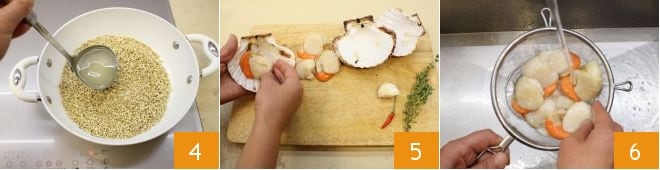 wenn dieser vollständig verdampft ist, fahren Sie mit dem Kochen bei mittlerer Hitze für etwa 30 Minuten fort (oder so lange, wie auf der Verpackung angegeben), indem Sie nach und nach die Fischbrühe 4 hinzufügen, einen Schöpflöffel nach dem anderen, wie bei einem Risotto. In der Zwischenzeit lösen Sie die Jakobsmuscheln aus der Schale 5, dann spülen Sie sie unter fließendem Wasser ab 6