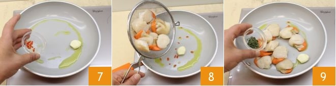 In einer anderen Pfanne erhitzen Sie weitere 15 g Olivenöl, fügen Sie die Knoblauchzehe und die gehackte rote Chilischote hinzu 7, braten Sie alles an und geben Sie dann die Jakobsmuscheln dazu 8, aromatisieren Sie mit Thymian 9,