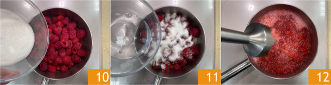In der Zwischenzeit bereiten Sie das Himbeergelee vor: Weichen Sie die Gelatine in kaltem Wasser ein. Geben Sie die Himbeeren in einen Topf, fügen Sie den Zucker 10 und das Wasser hinzu 11. Bringen Sie es zum Kochen und lassen Sie es bei mittlerer bis hoher Hitze etwa 10 Minuten köcheln. Wenn die Himbeeren zerfallen sind, nehmen Sie den Topf vom Herd und pürieren Sie alles mit einem Stabmixer 12.