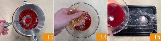 Seihen Sie das Gemisch durch ein feinmaschiges Sieb und sammeln Sie die Flüssigkeit in einer Schüssel 13. Fügen Sie die gut ausgedrückte Gelatine hinzu 14 und rühren Sie, bis sie vollständig aufgelöst ist. Geben Sie alles in eine ovale Form von 18 cm, die mit Folie ausgelegt ist 15.