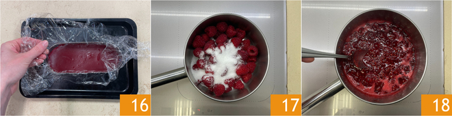 Stellen Sie es in den Kühlschrank und lassen Sie es eine Stunde fest werden 16. Nun bereiten Sie die Sauce zur Dekoration vor: Geben Sie die Himbeeren und den Zucker in einen Topf 17 und lassen Sie es bei mittlerer bis hoher Hitze etwa 10 Minuten reduzieren, bis es die Konsistenz einer Konfitüre hat 18.
