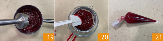 Nehmen Sie es vom Herd und pürieren Sie es mit einem Stabmixer 19. Seihen Sie es durch ein feinmaschiges Sieb, um die Kerne zu entfernen 20, dann geben Sie es in einen Spritzbeutel 21 und bewahren Sie es im Kühlschrank auf.