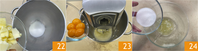 Bereiten Sie den Biskuit vor: Geben Sie in die Schüssel einer Küchenmaschine den Zucker und die weiche Butter 22, und schlagen Sie, bis eine weiche Konsistenz erreicht ist. Fügen Sie die Eigelbe einzeln hinzu 23, bis sie alle aufgenommen sind. Alternativ können Sie die Eigelbe schnell verquirlen und in die Küchenmaschine einfließen lassen. In einer Schüssel mischen Sie das Eiweiß und den Zucker 24.