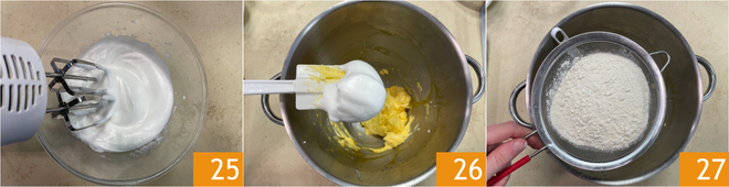 Schlagen Sie das Eiweiß mit den elektrischen Rührgeräten steif 25, und fügen Sie es dann nach und nach der Buttermischung hinzu 26, wobei Sie es abwechselnd mit dem gesiebten Mehl 27 unterheben. Rühren Sie, bis der Teig homogen ist.