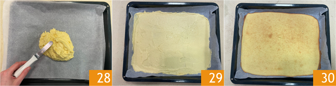 Verteilen Sie den Teig auf einem mit Backpapier ausgelegten Blech 28 und glätten Sie ihn mit einem Spatel 29. Backen Sie ihn im vorgeheizten statischen Ofen bei 220°C für 8-10 Minuten 30.