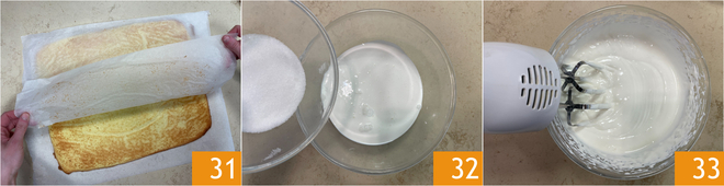 Nehmen Sie den Biskuit aus dem Ofen und drehen Sie ihn auf ein weiteres Blatt Backpapier 31, dann bedecken Sie ihn sofort mit Folie; so bleibt er feucht und elastisch. Lassen Sie ihn abkühlen, dann schneiden Sie den Biskuit mit einer ovalen Form von 21 cm aus. Für die Zubereitung der Bayerischen Creme geben Sie Sahne und Zucker in eine Schüssel 32, und schlagen Sie die Mischung mit den elektrischen Rührgeräten halb steif 33.