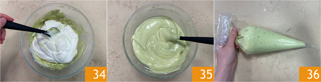 Fügen Sie die halbfest geschlagene Sahne in drei Teilen zur Crème anglaise hinzu 34 und rühren Sie, bis eine homogene Masse entsteht 35. Geben Sie die Bayerische Creme in einen Spritzbeutel 36.