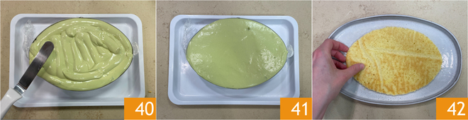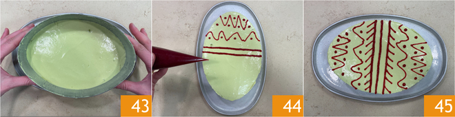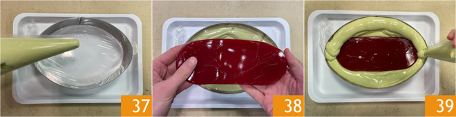 Platzieren Sie dieselbe ovale Form, die Sie für den Biskuit verwendet haben, auf einem Tablett mit Backpapier und legen Sie sie mit Folie aus. Füllen Sie die Form mit mehr als der Hälfte der Bayerischen Creme 37 und lassen Sie in der Mitte Platz, wo Sie das Himbeergelee einfügen 38. Decken Sie es mit der restlichen Bayerischen Creme ab 39.