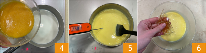 Gießen Sie die Mischung aus Eigelb und Zucker in den Topf mit der Milch 4 und erhitzen Sie sie unter ständigem Rühren auf 85°C, damit sie nicht am Boden anhaftet 5. Geben Sie alles in eine Schüssel, fügen Sie die gut ausgedrückte Blattgelatine hinzu 6 und rühren Sie, bis sie vollständig geschmolzen ist.