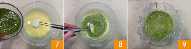 Fügen Sie die Pistazienpaste hinzu 7 und rühren Sie gut um 8. Decken Sie die Mischung mit Frischhaltefolie ab 9 und kühlen Sie sie eine Stunde im Kühlschrank.