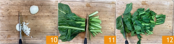 Schälen und hacken Sie die Zwiebel fein 10. Entfernen Sie die Stiele des Mangolds 11 und schneiden Sie die Blätter grob 12.