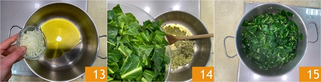 Dünsten Sie die Zwiebeln in einer Pfanne mit einem Schuss Öl an 13, fügen Sie dann den Mangold hinzu 14, salzen, pfeffern und kochen Sie für ein paar Minuten 15.