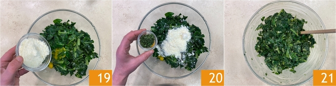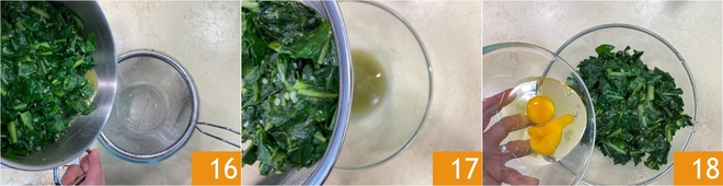 Geben Sie den Mangold in ein Sieb 16 und lassen Sie das überschüssige Wasser abtropfen 17. Sobald er abgekühlt ist, geben Sie den Mangold in eine Schüssel und fügen Sie die Eier hinzu 18.