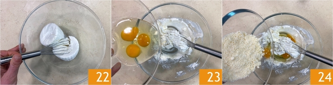 Stellen Sie die Mischung beiseite und bereiten Sie die Ricottafüllung vor: Geben Sie den Ricotta in eine andere Schüssel und bearbeiten Sie ihn mit einem Schneebesen oder einem Teigschaber, um ihn weich zu machen 22, dann fügen Sie die Eier 23 und den geriebenen Parmigiano Reggiano DOP 24 hinzu.