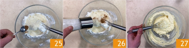 Würzen Sie mit Muskatnuss 25 und Salz 26, dann vermengen Sie alles gut mit dem Schneebesen, bis Sie eine cremige und homogene Konsistenz erhalten 27.