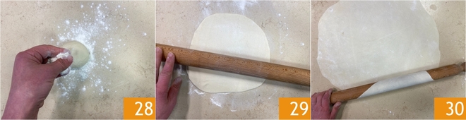 Stellen Sie die Ricottafüllung beiseite und kehren Sie zum Teig zurück: Nehmen Sie die 100 g Kugel und bestäuben Sie sie mit etwas Mehl oben und unten 28. Rollen Sie den Teig vorsichtig mit dem Nudelholz aus, bis Sie ein sehr dünnes Blatt mit einem Durchmesser von mindestens 40 cm erhalten 29. Wickeln Sie das Blatt um das Nudelholz, um es leichter bewegen zu können 30.