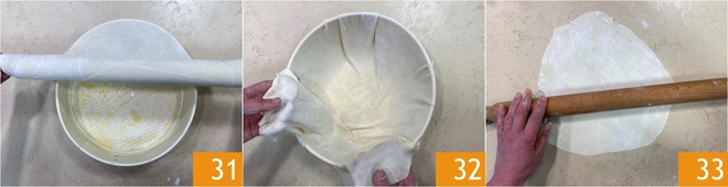 Rollen Sie das Blatt auf einer zuvor mit Öl bestrichenen Springform mit 28 cm Durchmesser aus 31. Helfen Sie sich mit den Händen, um es zu verbreiten, ohne es zu zerreißen 32, und lassen Sie es perfekt an der Basis und den Rändern der Form haften; in diesem Fall sollte das Blatt reichlich über die Seiten der Form hinausreichen. Rollen Sie eine der kleineren Teigkugeln aus, diesmal bis zu einem Durchmesser von 28 cm, da es nur die Basis abdecken wird 32.