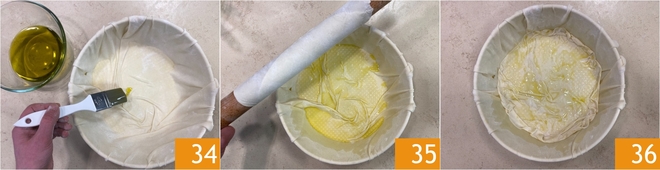 Bestreichen Sie das erste Blatt mit Öl 33 und legen Sie das zweite in die Form, wobei Sie sich immer mit dem Nudelholz helfen 35. Fahren Sie auf diese Weise fort, bis Sie insgesamt 10 Schichten erstellt haben, wobei Sie jede Schicht mit Öl bestreichen, bevor Sie die nächste hinzufügen 36.