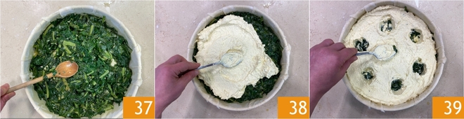 Geben Sie die Mangoldmischung auf die Basis und glätten Sie die Oberfläche 37, fügen Sie dann auch die Ricottacreme hinzu und verteilen Sie sie gleichmäßig 38. Machen Sie mit dem Rücken eines Löffels 7 Mulden: eine in der Mitte und 6 seitlich 39.
