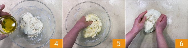 Fügen Sie auch das Öl hinzu 4 und kneten Sie weiter in der Schüssel, wenn nötig mit einem Teigschaber 5. Wenn die Zutaten gut vermischt sind, geben Sie den Teig auf eine leicht bemehlte Arbeitsfläche und kneten Sie ihn weiter, bis Sie einen glatten und elastischen Teig erhalten 6.