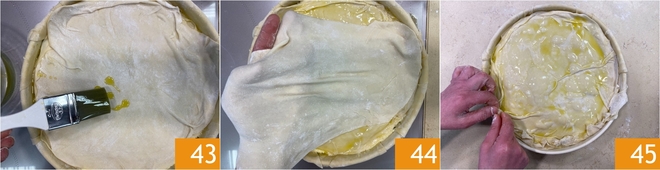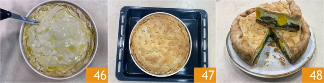 Schneiden Sie mit einer Schere kleine Schnitte in den oberen Teil der Torte, um zu verhindern, dass sie beim Backen aufbläht 46, dann backen Sie sie im vorgeheizten statischen Ofen bei 180° für etwa 80-90 Minuten, wobei Sie die Form auf den unteren Rost stellen. Sobald sie gebacken ist, nehmen Sie sie aus dem Ofen und lassen Sie sie in der Form abkühlen 47. Ihre Ostertorte ist bereit, in Scheiben geschnitten und serviert zu werden 48!