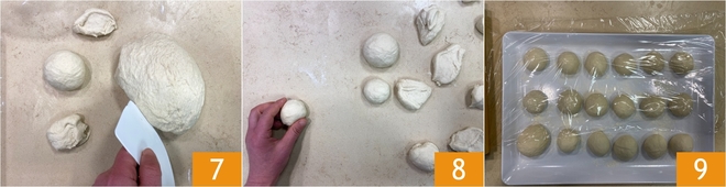 Teilen Sie nun den Teig in 18 Stücke, eines für jede Schicht der Ostertorte: Das erste Stück sollte 100 g wiegen und dient als Basis, die anderen etwa 50 g 7. Formen Sie jedes Stück zu einer Kugel 8 und legen Sie die entstandenen Kugeln auf ein Tablett 8. Decken Sie es mit Frischhaltefolie ab und lassen Sie es bei Raumtemperatur ruhen, während Sie die Füllung vorbereiten 9.