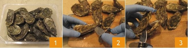Um die gratinierten Austern mit Pilzen zuzubereiten, müssen Sie die Austern öffnen: Um die Austern mit Zitrone und Pfeffer zuzubereiten, vergewissern Sie sich, dass die Schalen der Austern geschlossen sind 1, dann öffnen Sie die Austern, das ist ein sehr heikler Vorgang, verwenden Sie das spezielle Messer mit der dünnen Spitze, den Schutz am Griff, um die Finger zu schützen, und einen festen Griff. Halten Sie die Auster mit einer Hand fest und greifen Sie mit der anderen das Messer, suchen Sie nach der Öffnung (auf Wunsch können Sie die Austern bereits durchbohrt in der Fischhandlung anfordern, um das Öffnen zu erleichtern), führen Sie die Klinge ein und durchtrennen Sie den Muskel, der sich im mittleren Bereich befindet 2, nachdem Sie ihn durchtrennt haben, wird es einfacher sein, der Umrandung zu folgen und die Auster vollständig zu öffnen 3.