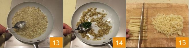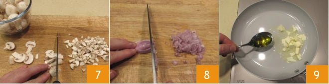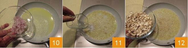 fügen Sie die gehackte Schalotte hinzu 10 und lassen Sie sie für 10 Minuten anbraten, verlängern Sie mit etwas warmem Wasser 11 und geben Sie dann auch die Champignons hinzu 12,