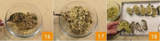 und geben Sie es in eine Schüssel, fügen Sie die in der Pfanne sautierten Pilze hinzu 16 und mischen Sie die Panade 17. Nehmen Sie die gesäuberten Schalen und fügen Sie in jede den Meeresfrüchte und bedecken Sie sie mit der Pilzpanade 18.