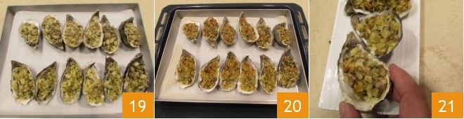 Legen Sie die Schalen auf ein Backblech 19 und stellen Sie sie für 5 Minuten unter den Grill des Ofens, bis die Panade knusprig und goldbraun ist 20. Nehmen Sie die gratinierten Austern mit Pilzen aus dem Ofen und lassen Sie sie abkühlen, bevor Sie sie servieren 21.