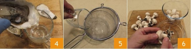 Öffnen Sie die Austern und sammeln Sie deren Flüssigkeit in einer kleinen Schüssel 4, dann filtern Sie sie durch ein Sieb 5 und lösen Sie die Auster von der Schale. Bürsten Sie die Hälfte der Schalen, da sie zur Aufbewahrung der Austern und des Paniermehls benötigt werden. Bereiten Sie nun die Panade vor, reinigen Sie die Champignons 6