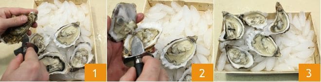 Um die gratinierten Austern mit Sardellen und Kapern aus Pantelleria zuzubereiten, beginnen Sie damit, die Austern zu öffnen. Dies ist eine sehr heikle Aufgabe. Besorgen Sie sich das spezielle Messer mit der dünnen Spitze, dem Schutz am Griff, um die Finger zu schützen, und einem festen Griff. Halten Sie die Auster mit einer Hand fest und nehmen Sie mit der anderen das Messer und suchen Sie nach der Öffnung 1 (Sie können in der Fischhandlung Austern anfordern, die bereits angebohrt sind, um das Öffnen zu erleichtern). Führen Sie die Klinge ein und durchtrennen Sie den Muskel, der sich in der Mitte befindet, und öffnen Sie die Schale zur Hälfte 2, achten Sie darauf, das Austernwasser nicht zu verschütten, das Sie in einer Schüssel auffangen und für die Zubereitung aufbewahren können. Entfernen Sie eine Hälfte der Schale und bewahren Sie die mit der Muschel auf 3.